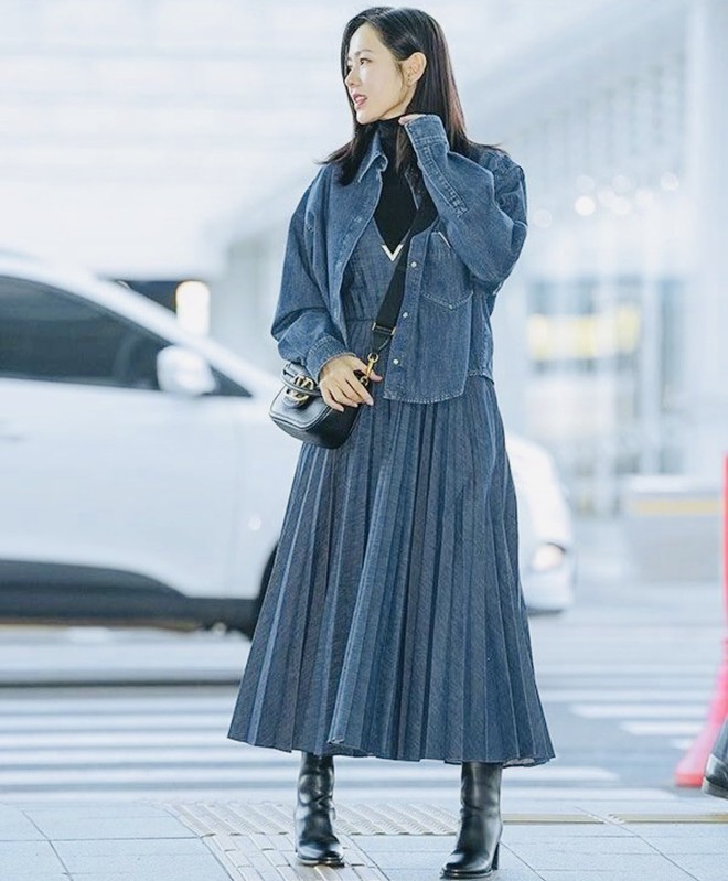 Trang phục denim đã trở nên rất quen thuộc với chị em. Kiểu đồ này không hề giới hạn độ tuổi người mặc. Với nét bụi bặm và cá tính, những món đồ mang chất liệu vải denim sẽ giúp vẻ ngoài của chị em thêm phần trẻ trung, năng động. Son Ye Jin diện trang phục denim khá thường xuyên. Nữ diễn viên yêu thích quần jeans, chân váy denim hoặc set áo khoác + quần ống suông đồng bộ.