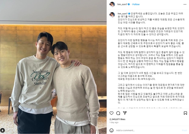 Bài đăng trên lập tức gây sốt MXH với hơn 2,3 triệu lượt thả tim, cao gấp nhiều lần các bài viết trước đó. Chi tiết hơn, đây là bài đăng có tổng số lượt tương tác cao nhất của Son kể từ tháng 12/2022. Không chỉ mừng cho hai ngôi sao, nhiều người còn chú ý đến chiếc áo nỉ dài tay mà Son Heung-min mặc khi chụp cùng Kang-in.