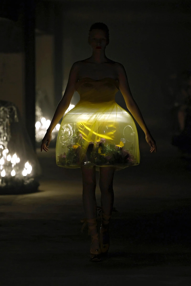 Chiếc váy ngắn màu vàng được kết hợp với nhiều chất liệu như vải voan, nhựa trong suốt. Điểm nhấn chính là phần tùng váy được thiết kế như một khu vườn hoa hồng. Bộ trang phục được kết hợp vòng cổ và sandals cao gót ánh kim của thương hiệu Undercover.