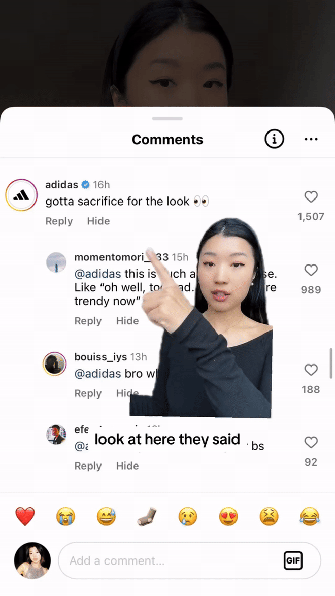 Tuy nhiên, drama mới thực sự bùng lên khi ở dưới bài đăng của Mengyan Yu, tài khoản tích xanh của adidas đã thả bình luận: "Muốn đẹp thì phải chịu thôi" (gotta sacrifice for the look) khiến dân tình không khỏi phẫn nộ. Sau đó, cô nàng này đã đáp trả lại với quan điểm không thể nào slay hơn: “Khi nhắc đến sneaker, tôi không muốn vì cái đẹp mà phải cắn răng chịu đựng nỗi lòng của mình. Giày cao gót thì còn thấy hợp lý. Sneaker là phải thoải mái khi mang vào chân, tôi quyết không đánh đổi cảm giác thoải mái của mình”.