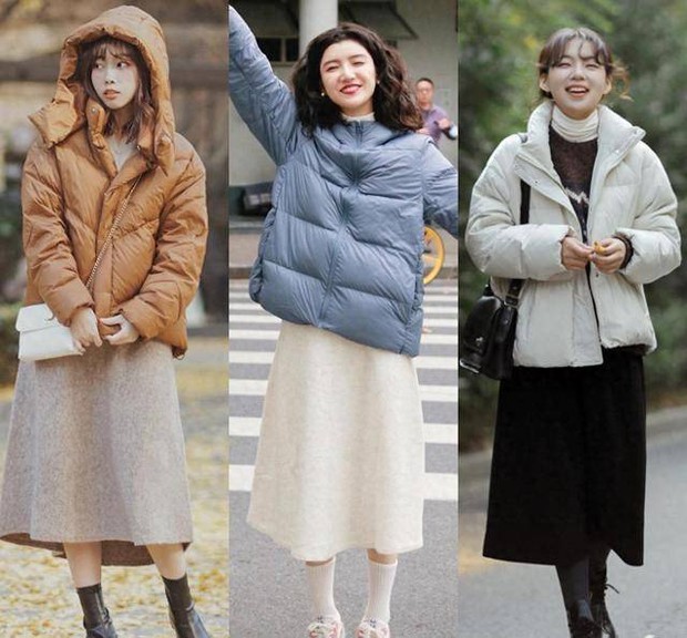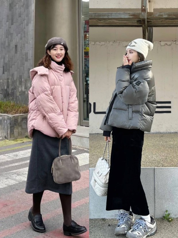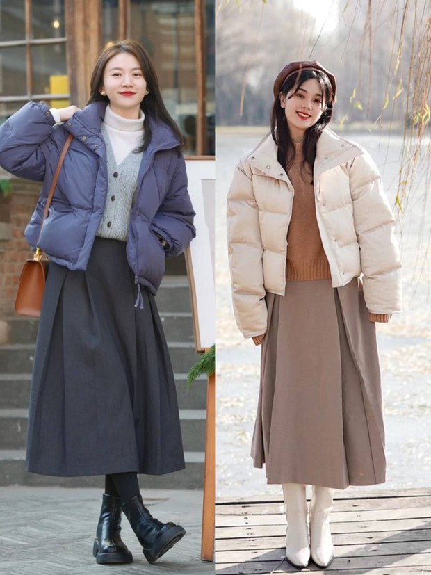 Áo phao kết hợp chân váy cũng là một công thức thú vị để các nàng diện trong đợt lạnh này.