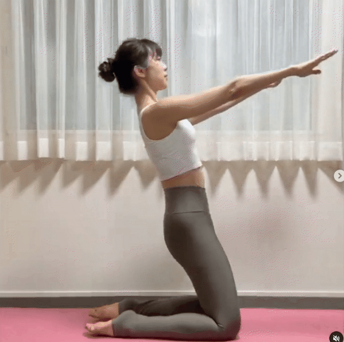 - Quỳ gối xuống thảm, hai chân rộng bằng vai, áp mũi chân xuống thảm.