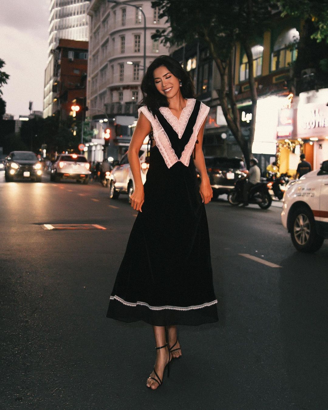 Thi thoảng, "cô dâu tháng 4" cũng dịu kha khi diện váy dài dạo phố. Minh Tú thường chọn các thiết kế dài chấm gót, ôm nhẹ để tinh tế khoe đường cong. Cô đi cùng giày cao gót "hack" dáng ngút ngàn.