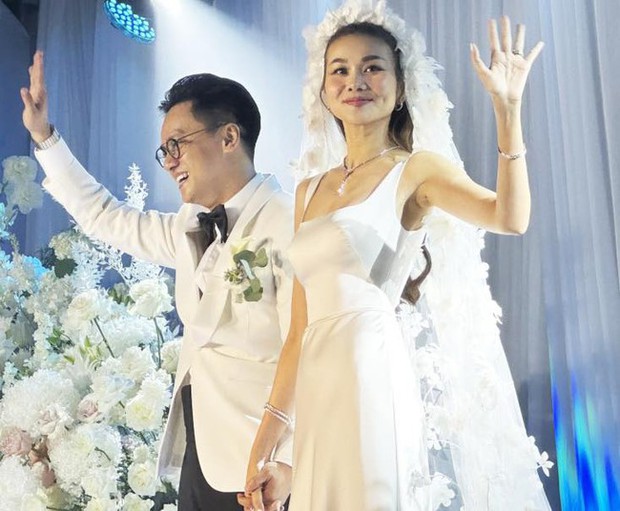 Cô dâu và chú rể nắm chặt tay nhau, thể hiện những cử chỉ ngọt lịm tim, tiến vào lễ đường trong sự chúc phúc của tất cả mọi người. Thanh Hằng chọn cho mình một thiết kế váy cưới trơn màu tinh giản kết hợp cùng khăn voan bồng bềnh vừa tôn lên nhan sắc sắc sảo của một "chị đại" Vbiz vừa phảng phất dịu dàng, e ấp của cô dâu trong ngày trọng đại.