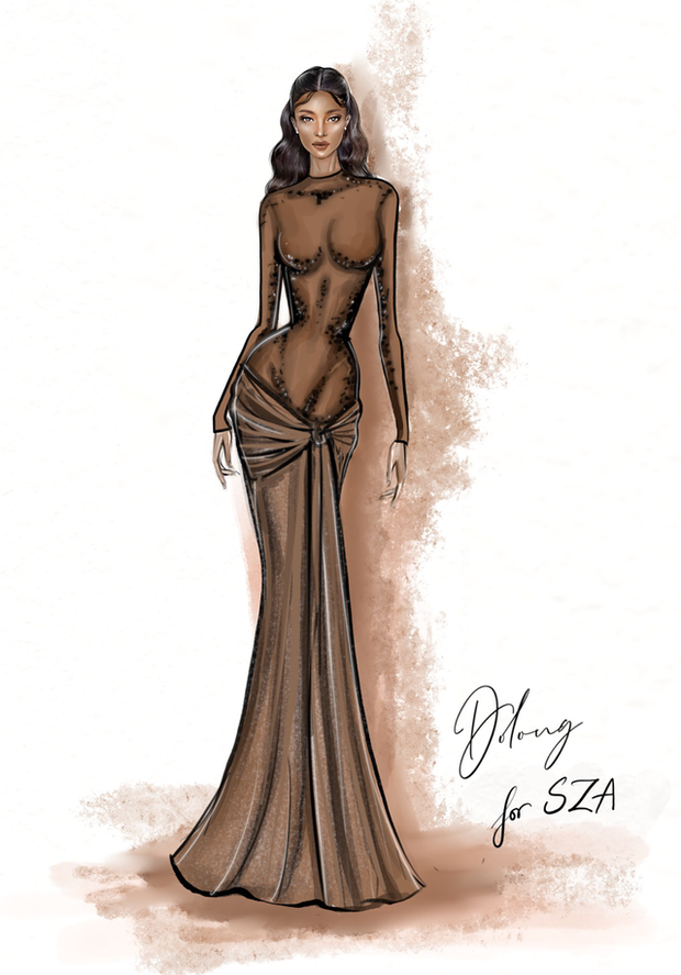 Được biết, ekip của SZA đã liên hệ NTK Đỗ Long đặt may riêng. Chiếc đầm được lấy ý tưởng từ bức tượng thần vệ nữ Venus de Milo kết hợp kỹ thuật in vải và đính kết công phu. Chất liệu thun kết hợp kỹ thuật in và vẽ dựa trên đường nét nóng bỏng của nữ ca sĩ.