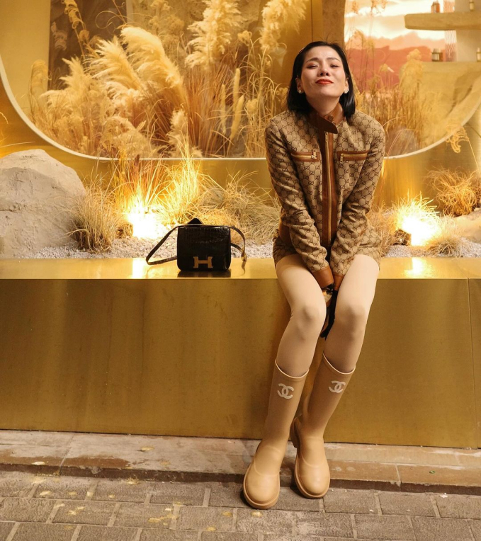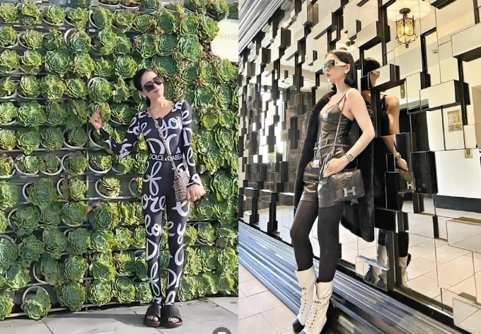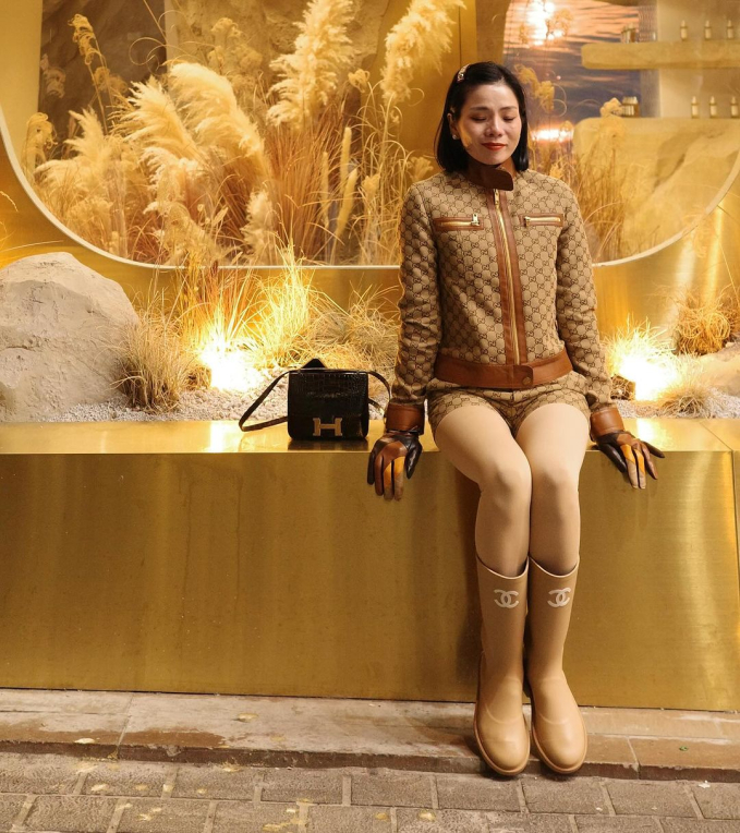 Về phía Lệ Quyên, nữ ca sĩ chọn set đồ gồm quần và áo riêng biệt. Cô phối trang phục với boots cổ cao và găng tay da. Tuy nhiên, việc ăn mặc "kín cổng cao tường" từ đầu đến chân khiến Lệ Quyên trông hơi bí, nặng nề và không toát ra được sự sang trọng của bộ đồ hiệu.