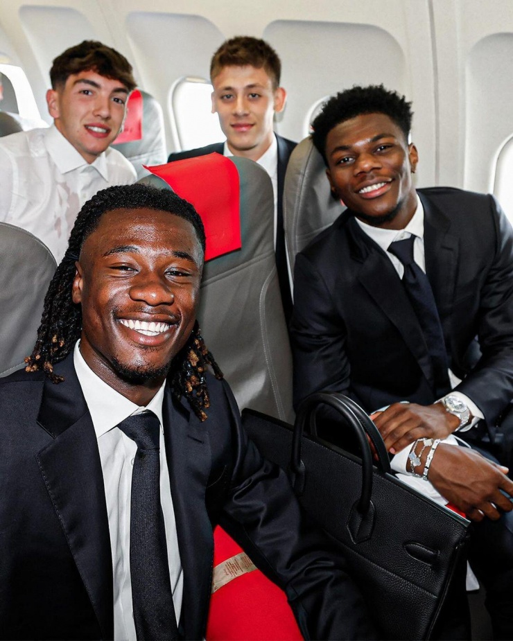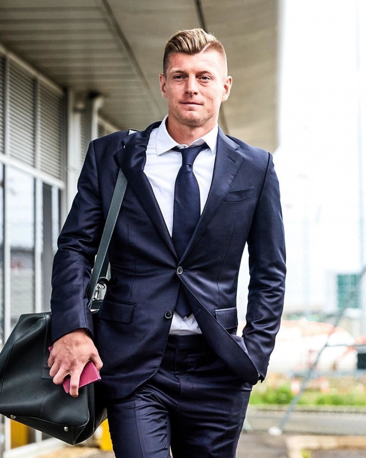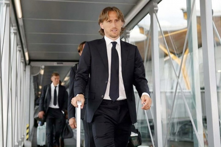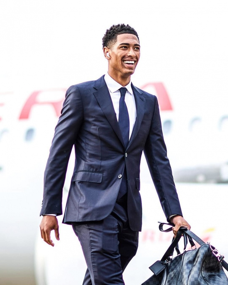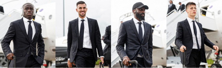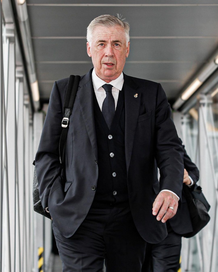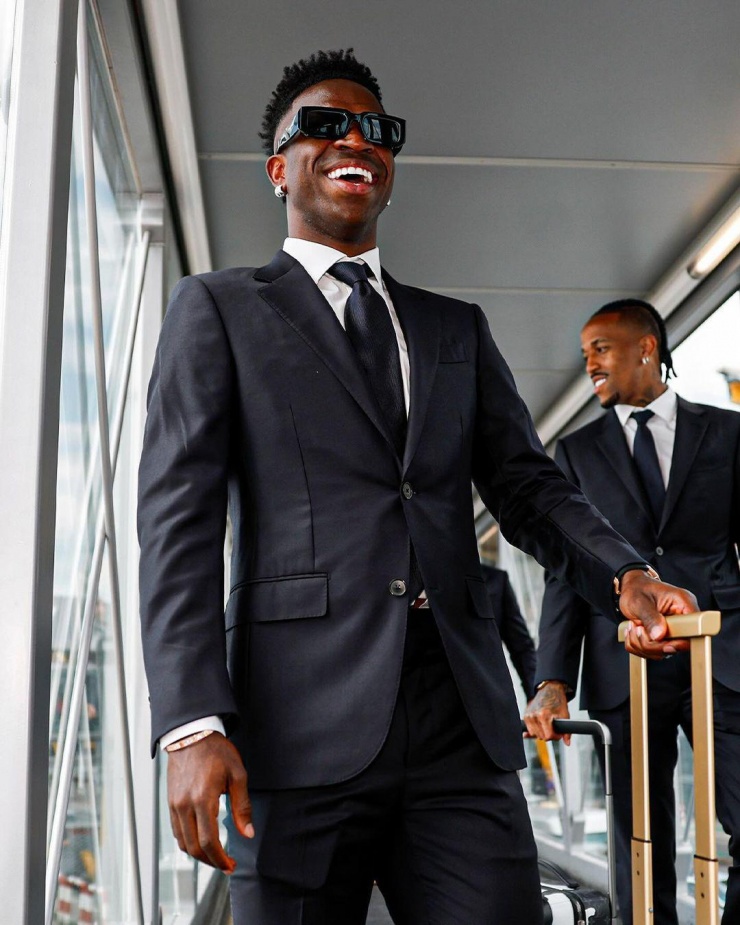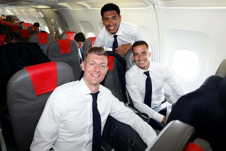 Ban huấn luyện cùng dàn cầu thủ Real Madrid đến London, Anh bằng chuyên cơ riêng, ngày 30/5. Các cầu thủ khoác lên mình bộ cánh của Zegna - thương hiệu 114 tuổi của Italy.