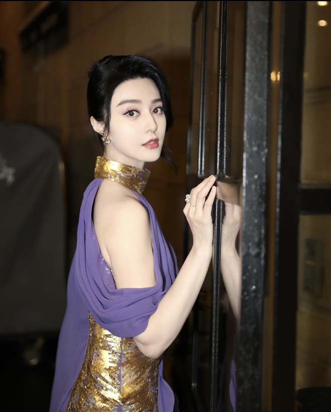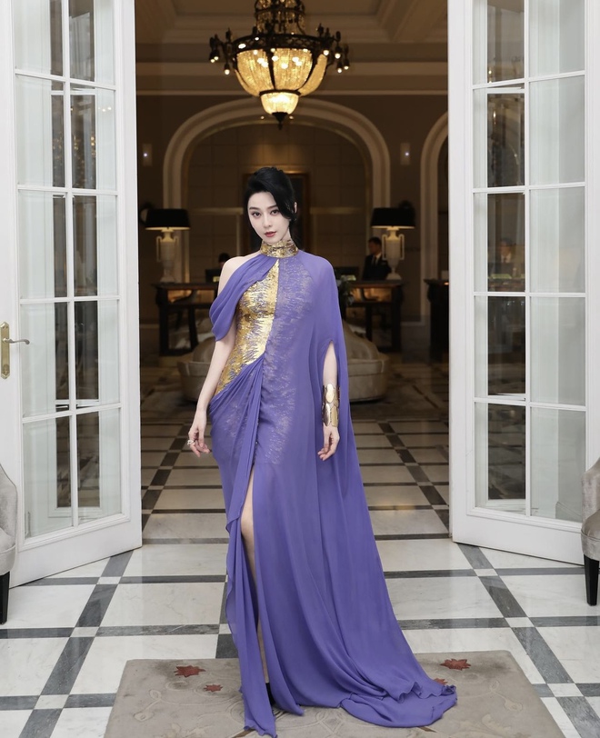 Xuất hiện tại sự kiện, Phạm Băng Băng đẹp hút hồn trong mẫu đầm màu tím phối ánh kim, thuộc BST FW23 Couture của thương hiệu Georges Chakra. Với lợi thế làn da trắng sáng cùng vóc dáng thon gọn, mỹ nhân họ Phạm đã “cân đẹp” thiết kế có màu sắc hơi sến súa, khó mặc. Cô kết hợp kiểu tóc búi cùng tông trang điểm nhẹ nhàng, nhấn vào màu son để tăng thêm vẻ yêu kiều, sang chảnh cho diện mạo.