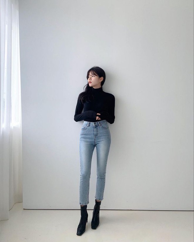 Diện áo cổ cao với quần jeans và chân váy là công thức cơ bản nhất mà bất kỳ ai trong chúng ta cũng từng lựa chọn. Cách phối này sẽ giúp vóc dáng của bạn trông nhỏ nhắn và thon gọn hơn. Ngoài ra, chúng còn mang đến cảm giác chỉn chu và lịch sự nên dù bạn diện đi học hay đi làm thì đều phù hợp.
