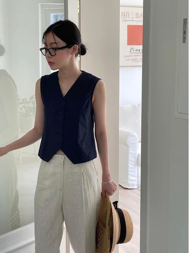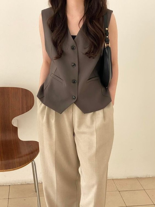 Nếu blazer là trang phục "quốc dân" trong mùa thu đông thì gile chính là phiên bản "quốc dân" của dịp xuân hè. Nói về sự thanh lịch, thời thượng thì không thể bỏ qua áo gile dáng ngắn sát nách. Item này mặc dù đạt chuẩn thời trang công sở nhưng không hề tạo cảm giác già dặn tẹo nào. Ngược lại còn vô cùng trẻ trung và dễ phối đồ. Chị em có thể mix áo gile cùng quần suông hoặc chân váy. Nàng nên chọn những màu neutral như be - trắng - đen vì những gam màu này không kén hoặc dìm da.