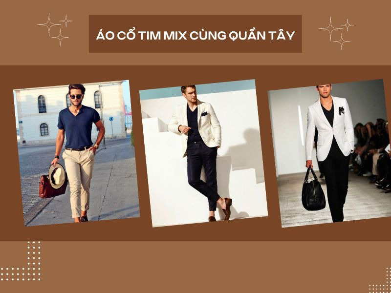 Áo thun cổ tim và quần tây tạo phong cách trẻ trung và chuyên nghiệp. Kết hợp áo thun cổ tim trắng với quần tây màu đen tạo vẻ sắc sảo và lịch lãm. Áo thun cổ tim in hoặc họa tiết phối với quần tây màu sáng tạo phong cách độc đáo và hiện đại. Tận dụng kết hợp này để tạo phong cách cá nhân và thời trang.