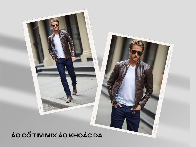 Áo thun cổ tim và áo khoác da tạo phong cách năng động. Kết hợp áo thun cổ tim trắng với áo khoác da màu đen tạo vẻ tinh tế và cá tính. Áo thun cổ tim in hoặc họa tiết phối với áo khoác da màu sáng tạo phong cách độc đáo và thời trang. Tận dụng kết hợp này để tạo phong cách cá nhân và phá cách.
