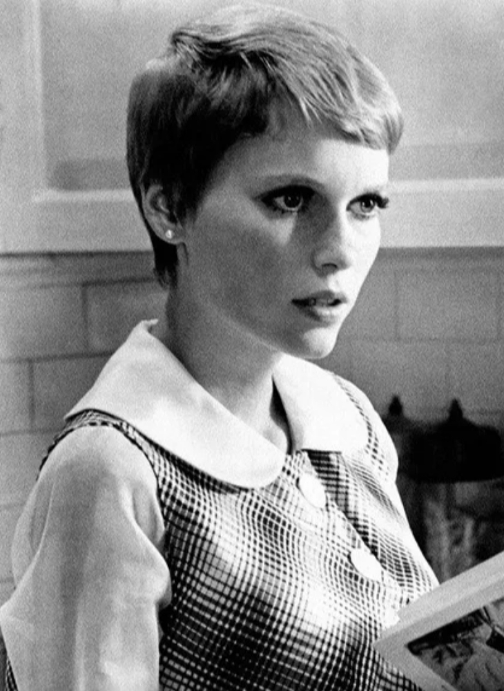 Thật là thiếu sót nếu nói về những kiểu tóc đẹp kinh điển mà không nhắc đến kiểu tóc pixie của Mia Farrow trong bộ phim Rosemary’s Baby. Hình ảnh cô nàng nhỏ nhắn với mái tóc pixie đã giúp ghi điểm trong mắt khán giả qua thước phim kinh dị. Kiểu tóc này cũng trở thành nguồn cảm hứng cho nhiều cô gái ở thời điểm bộ phim phát sóng. Mia Farrow đã tạo nên một biểu tượng phong cách với kiểu tóc ngắn sáng trong bộ phim kinh điển Rosemary’s Baby (1968).