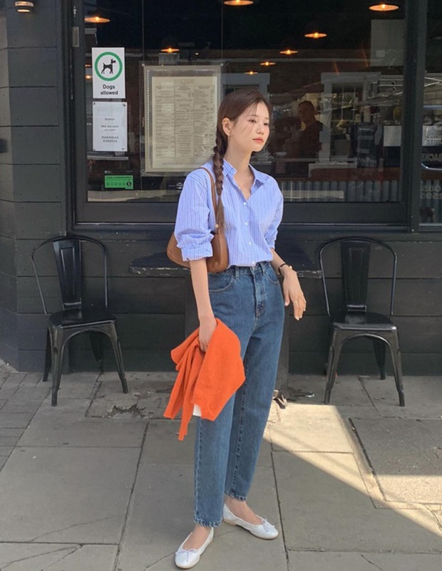 Muốn có được set đồ công sở trẻ trung, năng động mà không phải suy nghĩ nhiều, bạn hãy kết hợp áo sơ mi kẻ sọc với quần jeans ống đứng. Công thức này "hack" tuổi tối ưu, mà vẫn có sự chỉn chu, thanh lịch. Tổng thể thêm hài hòa nhờ đôi giày búp bê tông màu trắng và túi xách nâu nhạt.