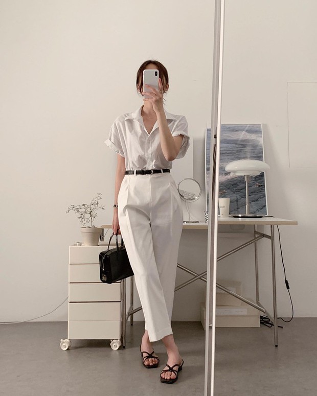 Công thức áo sơ mi trắng kẻ sọc và quần ống đứng, vải thô không quá cầu kỳ, nhưng vẫn ấn tượng. Bạn nên nhấn nhá một chiếc thắt lưng mảnh, bộ trang phục sẽ thêm phần tinh tế. Những món phụ kiện như dây chuyền mảnh hay khuyên tai giúp tổng thể trang phục hút mắt hơn, nhưng không làm giảm sự thanh lịch.