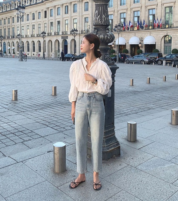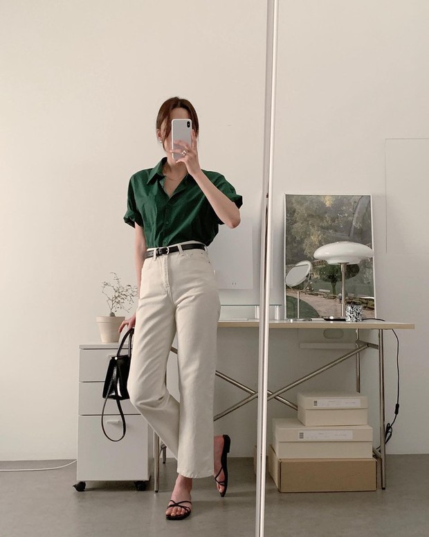 Ngoài quần âu đứng dáng, chị em nên bổ sung quần jeans trắng cho tủ đồ. Ưu điểm của quần jeans trắng, ống đứng là sự nữ tính, trẻ trung. Vẻ ngoài của người mặc trở nên nổi bật hơn, nhưng vẫn có sự trang nhã nhờ mẫu áo sơ mi màu xanh đậm. Các món đồ như thắt lưng da, sandal quai mảnh và túi xách màu đen cho hiệu quả nâng tầm vẻ sang xịn mịn cho outfit.