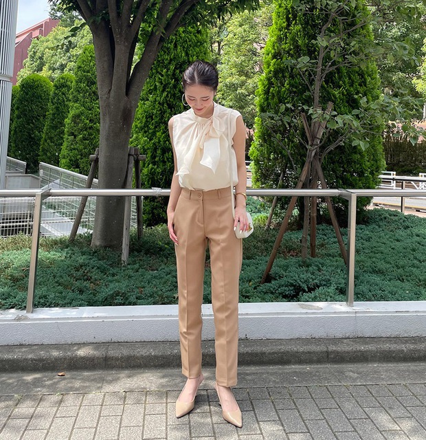 Áo blouse và quần âu ống đứng là công thức quen thuộc, nhưng vẫn đáng tham khảo. Sự kết hợp này giúp vẻ ngoài trở nên nữ tính và thanh lịch. Chị em nên sơ vin để bộ cánh công sở thêm phần chỉn chu, tôn dáng. Để đảm bảo sự chuyên nghiệp của trang phục công sở, một đôi giày cao gót mũi nhọn chính là mảnh ghép lý tưởng.