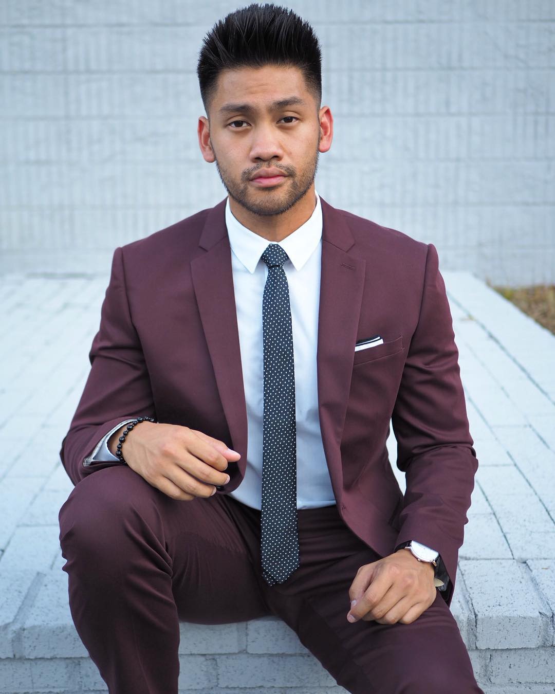 Màu sắc sinh động này trông càng tươi hơn khi kết hợp với áo sơ mi màu hồng hoặc đen. Cà vạt đen là sự lựa chọn tốt nhất ở đây, Bạn nên tránh chọn màu cà vạt trùng với suit đỏ tía, trừ khi bạn mặc áo sơ mi trắng vì nó sẽ khiến trang phục trở nên chìm đi.