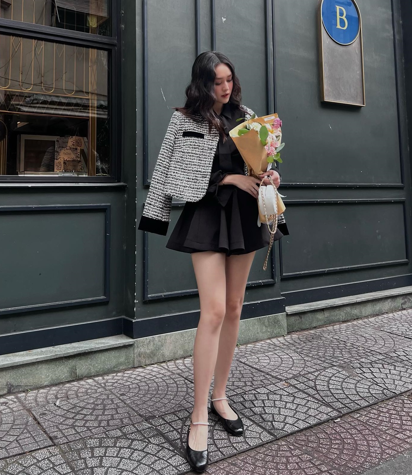 Áo khoác vải tweed được coi là "chìa khóa" cho vẻ ngoài sang trọng, quý phái. Á hậu Tường San đã khoác mẫu áo vải tweed bên ngoài váy ngắn, và đi giày Mary Jane. Với cách phối đồ này thì dù outfit mang tông màu đen làm chủ đạo, vẻ ngoài của người diện vẫn có nét trẻ trung, ngọt ngào.