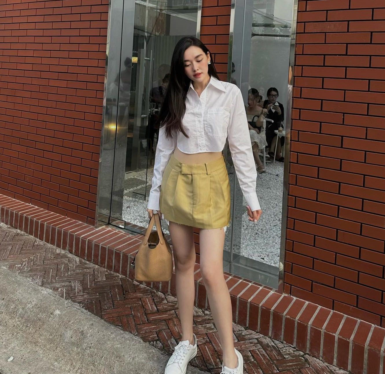 Diện áo sơ mi trắng nhưng Á hậu Tường San vẫn ghi điểm năng động và trẻ trung. Cô kết hợp sơ mi dáng lửng với chân váy ngắn, giày sneaker tông màu trắng. Vẻ hài hòa, trang nhã của bộ cánh được đảm bảo khi Tường San chọn một chiếc túi xách màu be, thay vì diện thiết kế màu sặc sỡ.