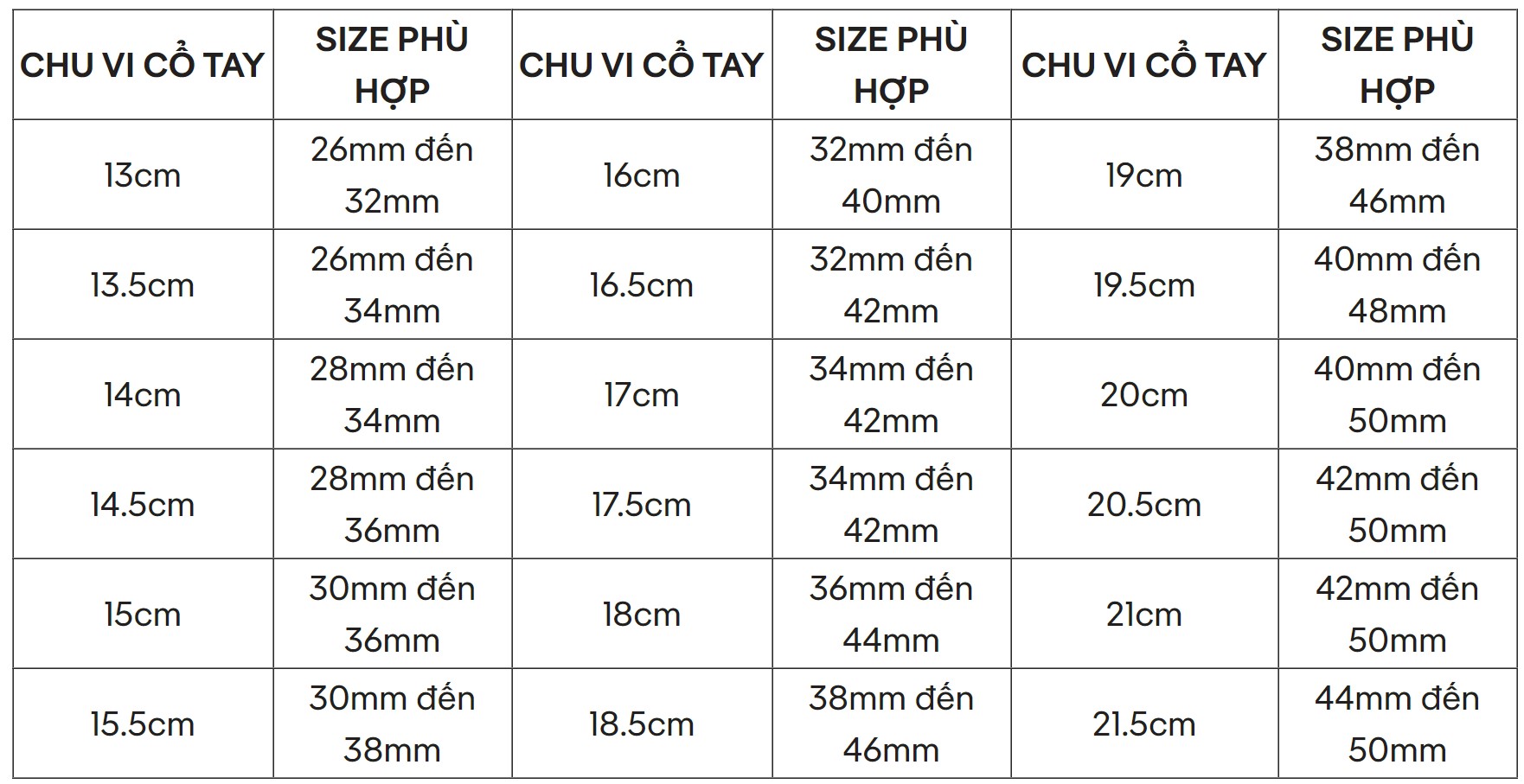 - Bước 2: Tra bảng cách chọn size đồng hồ cho tay của bạn như bảng bên dưới (áp dụng cho cả nam và nữ luôn nhé).