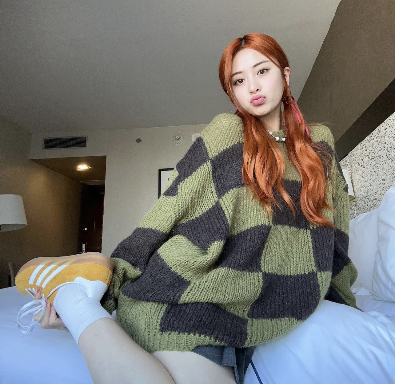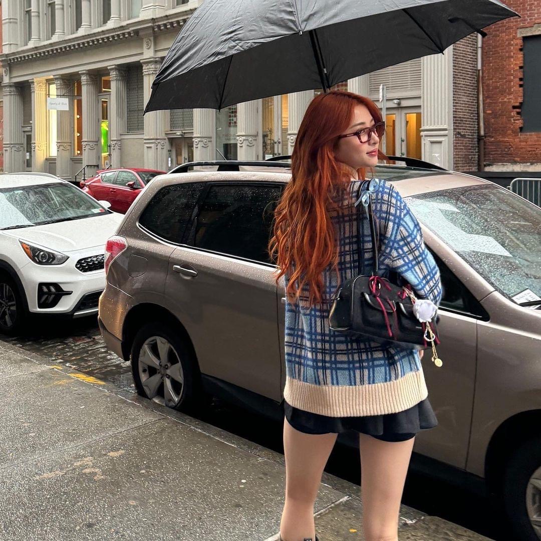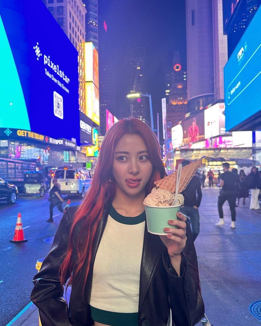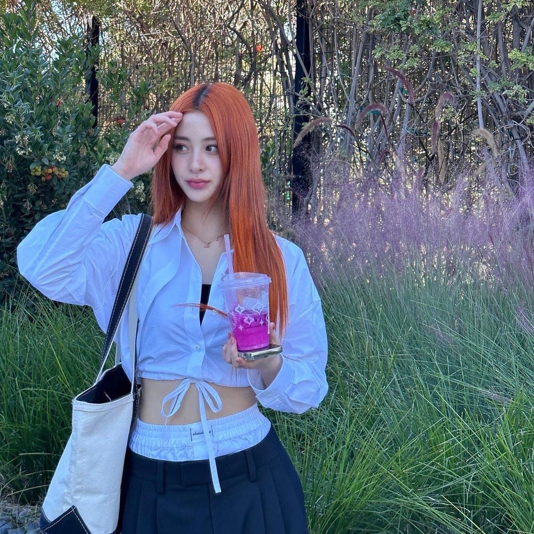 Nữ thần tượng nổi bần bật với mái tóc cam rực rỡ, tôn lên làn da trắng sáng cùng thần thái sắc lạnh, cool ngầu. Cô nàng lựa chọn phong cách trang điểm nhẹ nhàng, trong trẻo với điểm nhấn son bóng ở môi để diện mạo thêm phần thu hút. Bên cạnh đó, Huh Yunjin cũng nhận được nhiều lời khen có cánh với loạt outfit trẻ trung, năng động khó có thể rời mắt.