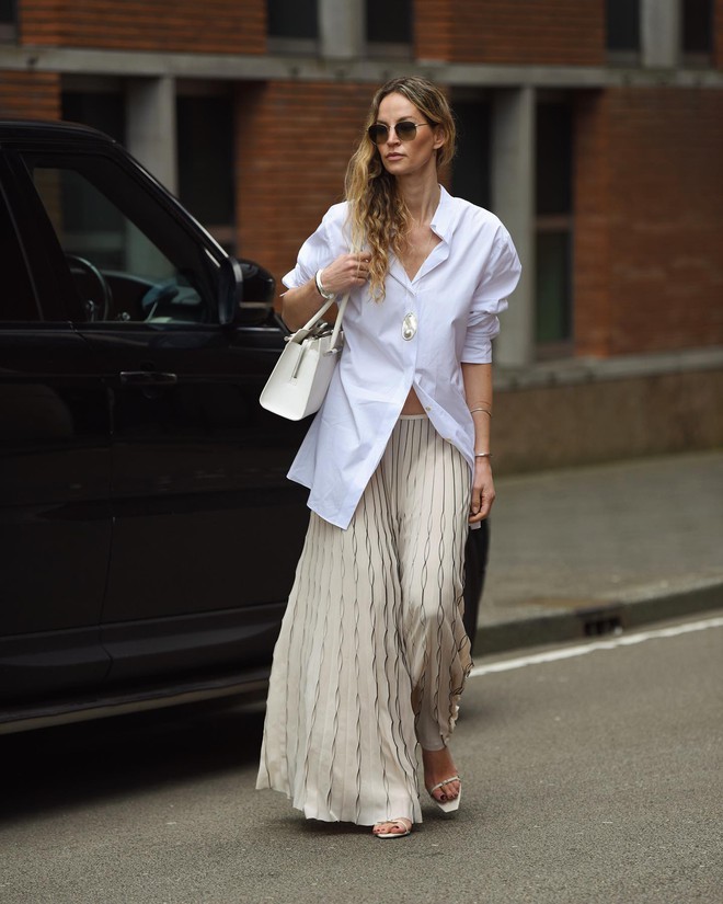Anouk Yve gợi ý một số công thức diện đồ như áo sơ mi trắng và chân váy họa tiết, áo sơ mi màu đen kết hợp cùng chân váy suông trang nhã, tinh tế. Các mẫu giày phù hợp với set áo sơ mi và chân váy dài bao gồm giày cao gót mũi nhọn, giày slingback hoặc sandal quai mảnh.