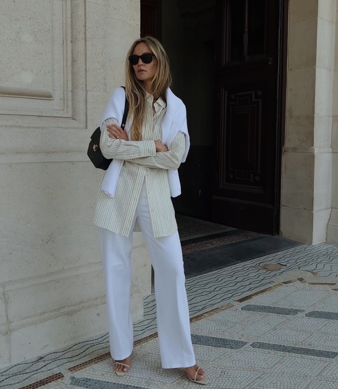Quần trắng phù hợp để diện vào mùa hè vì tạo cảm giác nhẹ nhàng, dịu mắt. Mẫu quần này ghi điểm ở nét dịu dàng, nữ tính nhưng vẫn "hack" tuổi hiệu quả. Bên cạnh những chiếc áo trơn màu, Anouk Yve còn kết hợp quần trắng cùng áo họa tiết.