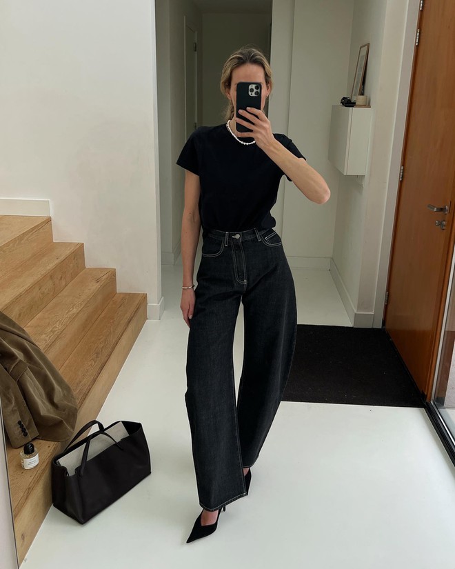 Áo thun và quần jeans đều là những món thời trang trẻ trung, năng động. Vậy nên, khi kết hợp hai item này với nhau, hiệu quả "hack" tuổi sẽ được tăng gấp đôi. Anouk Yve có cách diện áo thun và quần jeans rất nhã nhặn. Cô ưu tiên áo thun và quần jeans mang các tông màu trung tính như đen, trắng. Cách phối đồ này sẽ đảm bảo cho người diện vẻ ngoài thanh lịch, sang xịn mịn nhưng vẫn có sự trẻ trung, cá tính. Khi diện áo thun và quần jeans, các quý cô trên 40 tuổi nên sơ vin để tôn dáng tối ưu, đồng thời tạo sự chỉn chu, tinh tế cho cả tổng thể trang phục.