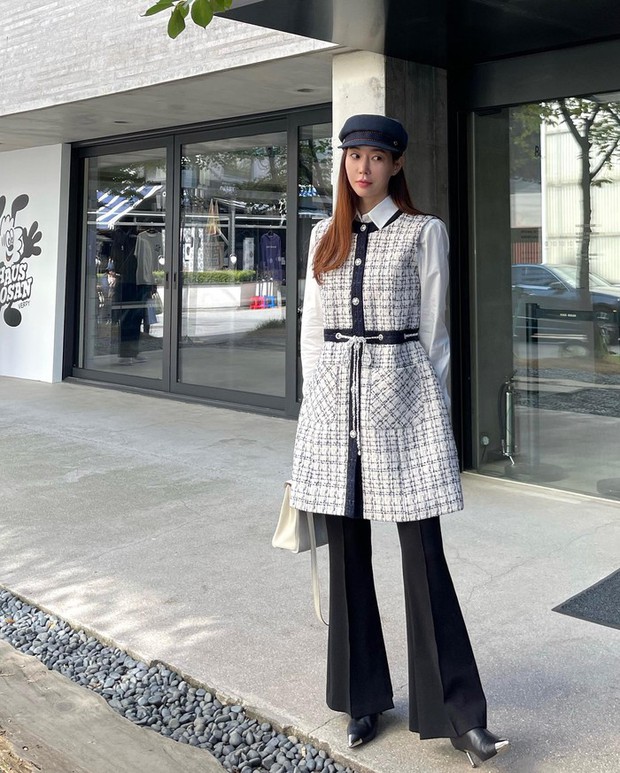 Biến tấu mẫu váy gile vải tweed thành một chiếc áo khoác ngoài, nàng fashion blogger có được bộ trang phục rất nổi bật. Cách phối đồ này cho hiệu quả tôn dáng cao ráo nhờ chi tiết nhấn eo, chiếc quần ống loe và đôi boots cao gót, mũi nhọn. Khi hoàn thiện bộ đồ bằng một chiếc mũ nồi, vẻ ngoài của người diện trông sang chảnh, yêu kiều hơn.