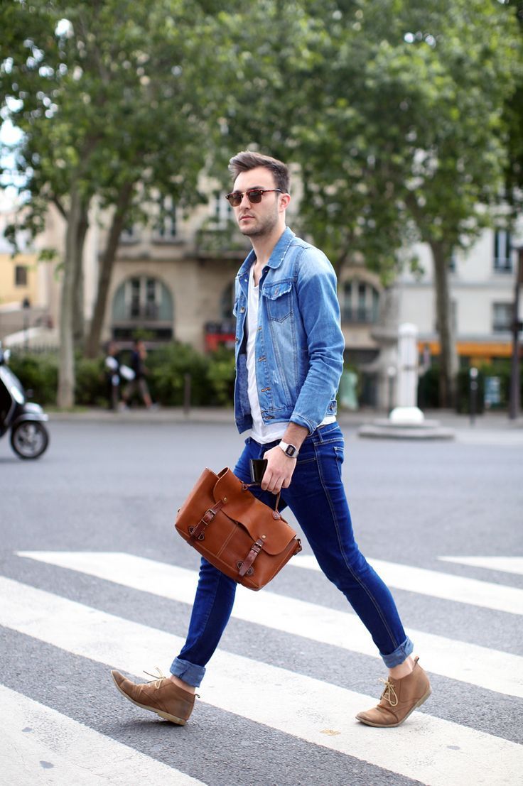 Hoặc bạn có thể ghi dấu ấn bằng tổng thể “denim on denim” bao gồm quần jeans, áo thun trắng và áo khoác denim. Sự kết hợp này sẽ đề cao tinh thần nam tính khi kết hợp với đôi chukka cổ điển.