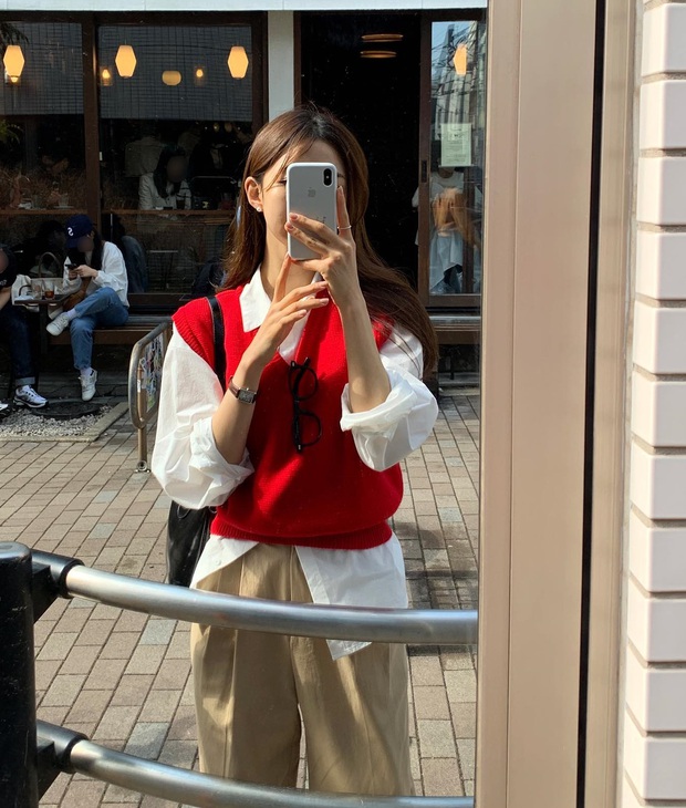 Trang phục tông màu đỏ chính là xu hướng của mùa lạnh năm nay. Việc bắt kịp xu hướng này cũng không hề khó, chị em hãy tham khảo công thức gồm áo gile đỏ tươi tắn kết hợp với áo sơ mi trắng, quần màu be. Công thức này rất trẻ trung và nổi bật nhưng vẫn hài hòa, thanh lịch. Bạn nên chọn túi xách và giày dép mang tông màu đen để nâng cấp vẻ sang xịn mịn cho bộ trang phục.