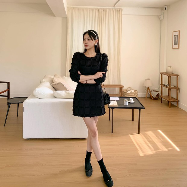 Váy đen tạo vẻ sang trọng cho người diện và giúp "hack" dáng thon thả. Nếu ưu tiên dáng váy ngắn trên đầu gối, bạn sẽ không lo vẻ ngoài bị cộng tuổi. Đừng bỏ qua những điểm nhấn như bờm tóc, khuyên tai. Các món đồ này tăng vẻ long lanh cho diện mạo.