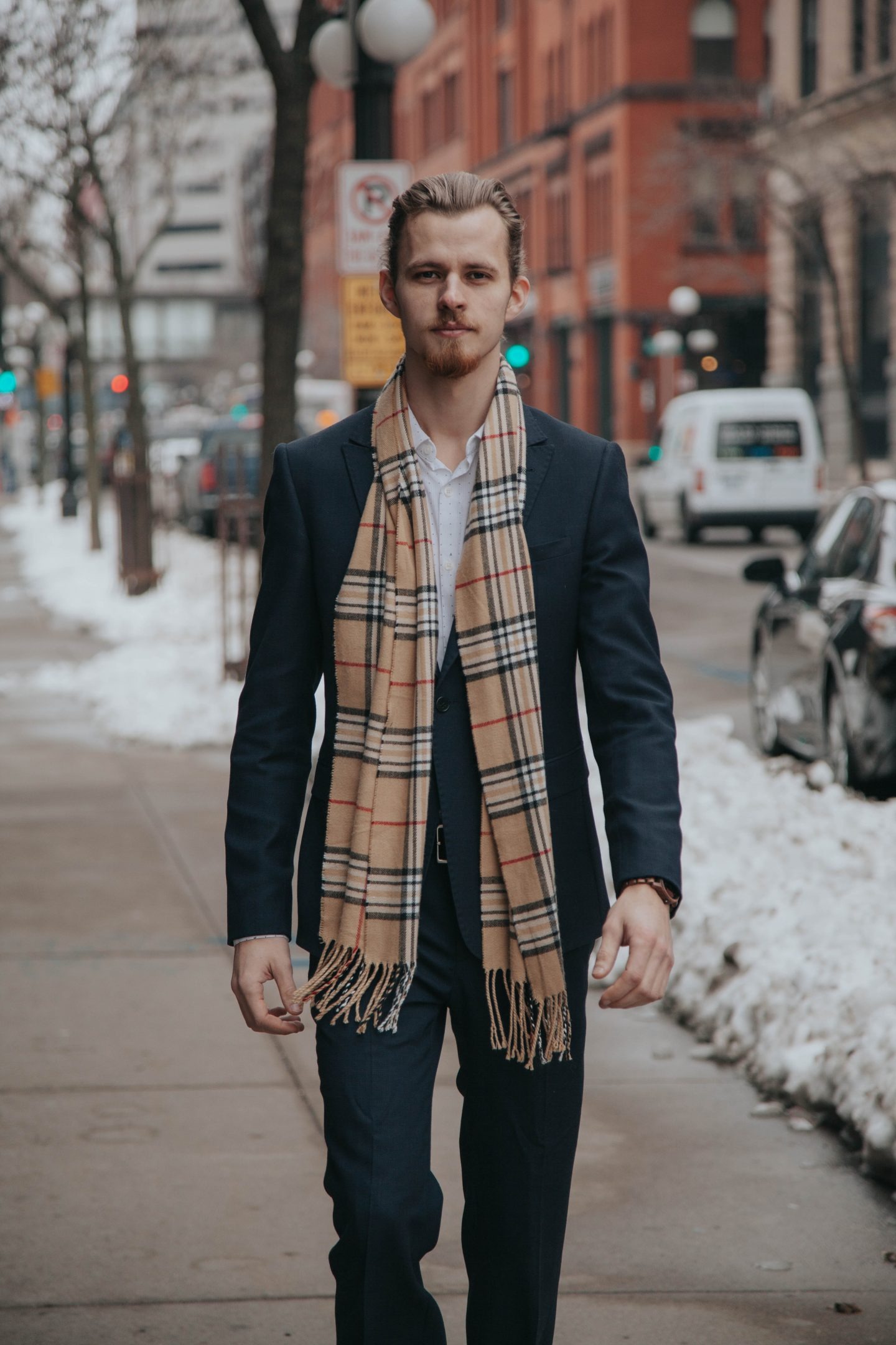 Chìa khóa để tạo nên một outfit hoàn hảo với khăn quàng cổ kết hợp những kiểu áo khoác lịch lãm như blazer hay sport coat rất đơn giản, đó là hãy đảo ngược những gì bạn đã làm ở cách phối long coat. Thay vì nhét toàn bộ khăn quàng cổ vào bên trong lớp áo khoác, hãy quấn khăn quanh cổ và để đuôi khăn thõng xuống ở bên ngoài áo khoác.