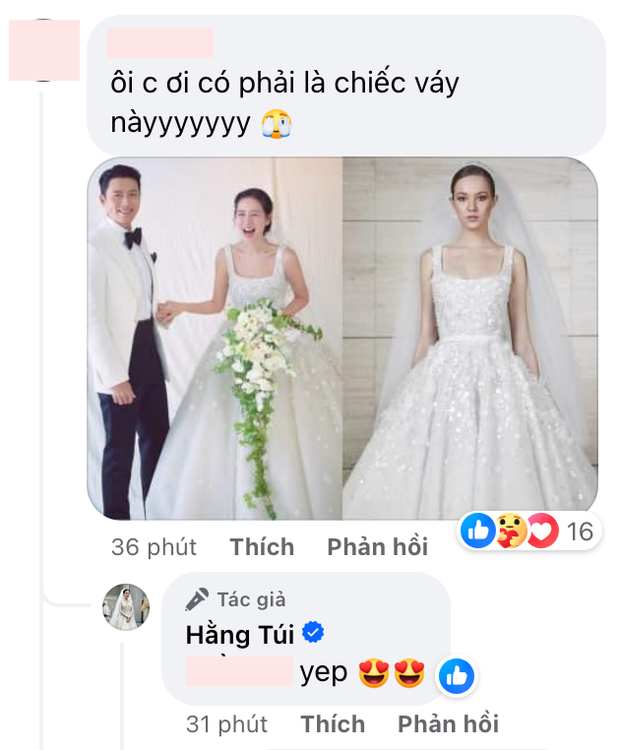 Đáng chú ý, mẫu váy mà Hằng Túi diện cũng được nhiều người nhận ra là thiết kế giống hệt với váy cưới của Son Ye Jin. Bản thân “bà trùm” bán hàng online cũng xác nhận đây chính là mẫu váy cưới trị giá nửa tỷ mà Son Ye Jin mặc khi chụp ảnh cưới. Hầu hết mọi người đều dành lời khen cho nhan sắc, vóc dáng của hot mom Hằng Túi. Bởi dù đã ở độ U40, trải qua vài lần sinh nở nhưng cô vẫn giữ được sắc vóc trẻ trung, cuốn hút đáng ngưỡng mộ.