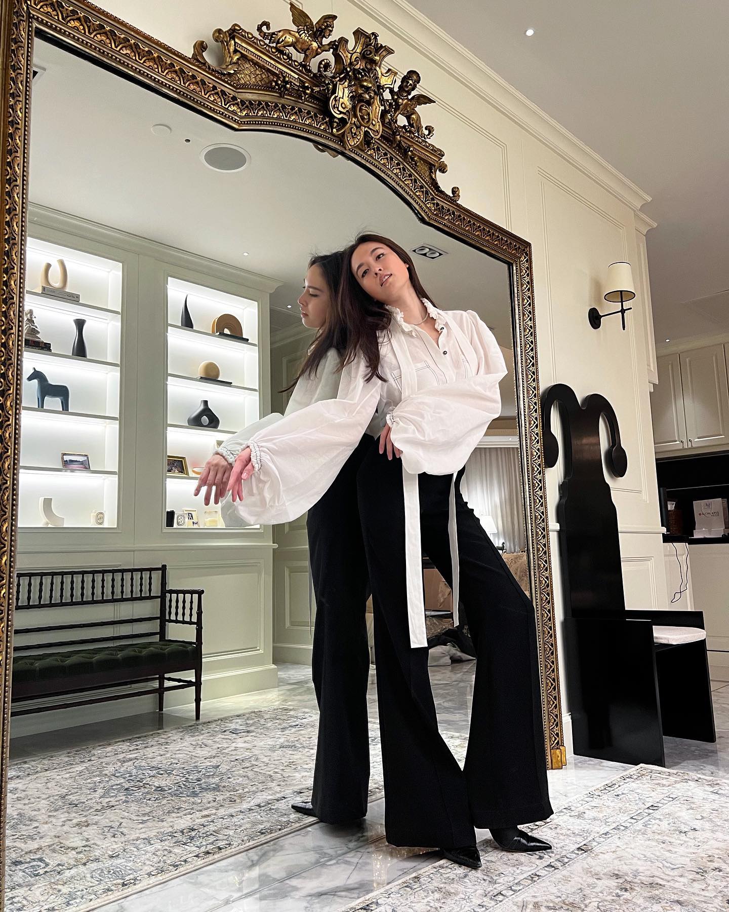 Áo blouse tay bồng mang đến nét nữ tính và yêu kiều cho người diện. Nong Poy đã có được bộ trang phục sang chảnh khi kết hợp áo blouse với quần đen ống loe và giày cao gót mũi nhọn. Sơ vin là thao tác không thể thiếu để tạo sự chỉn chu và tôn dáng hiệu quả.