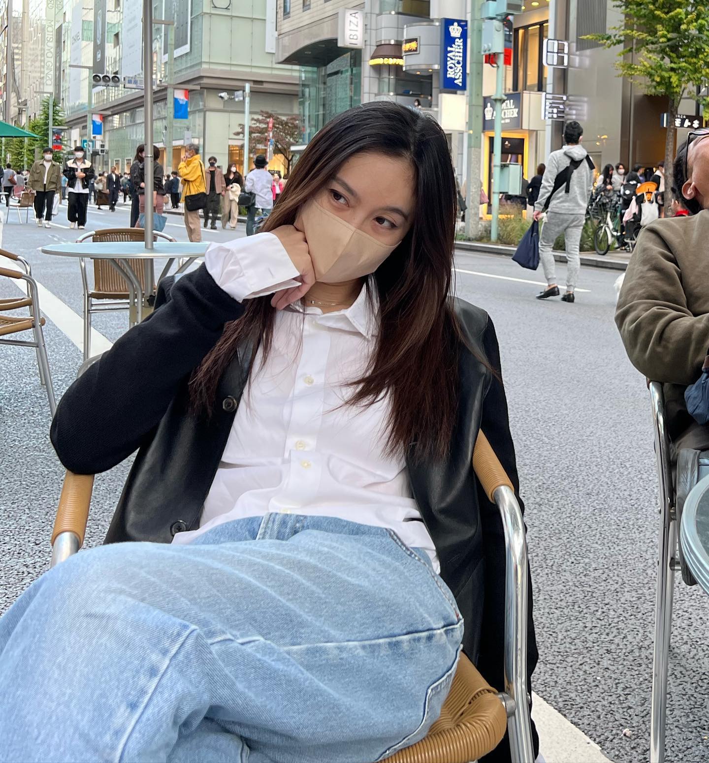 Set đồ gồm áo sơ mi trắng và quần jeans xanh của Nong Poy trở nên thanh lịch, sang xịn mịn hơn nhờ chiếc áo blazer vải da khoác ngoài. Đây là công thức mà các nàng có thể áp dụng để hoàn thiện phong cách mùa thu. Sợi dây chuyền mảnh Nong Poy chọn giúp bộ cánh trở nên long lanh hơn.