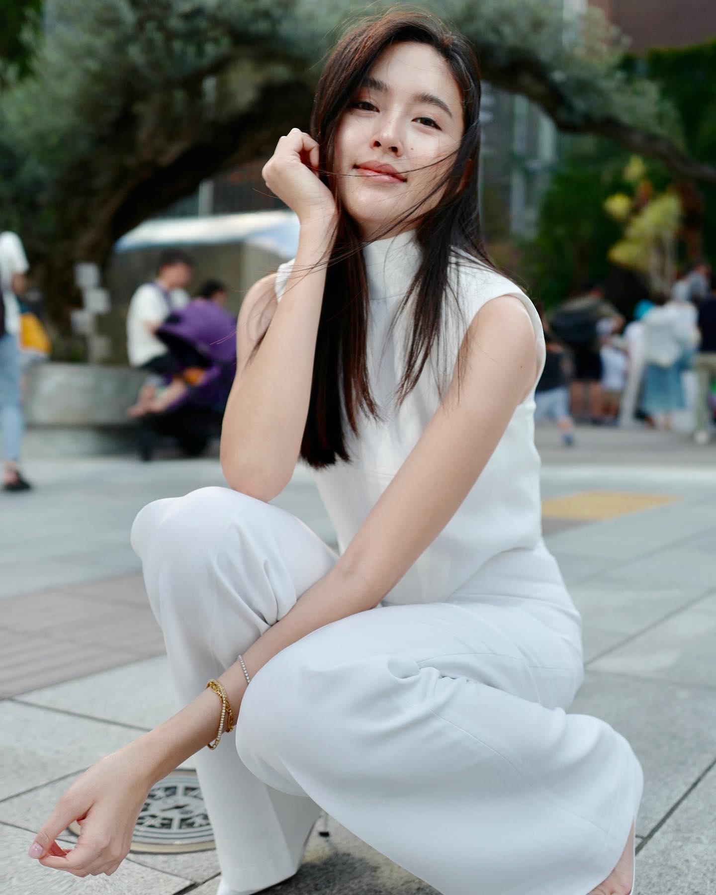Sự kết hợp giữa áo hai dây trắng và quần màu kem đã mang đến nét nữ tính, đồng thời tôn lên vẻ quyến rũ của người diện. Ngoài ra, tông màu trang nhã cũng đảm bảo sự tinh tế cho phong cách. Nong Poy giữ nguyên nét hài hòa của bộ trang phục bằng cách diện một chiếc túi màu be.