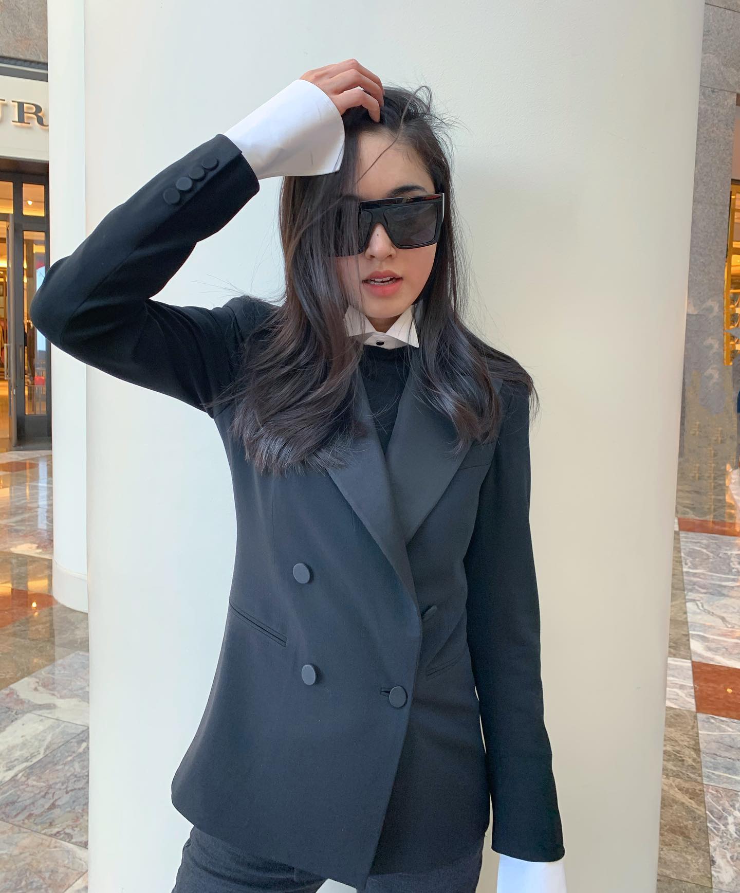 Diện váy sơ mi mang tông màu đen nhưng Nong Poy không hề bị cộng tuổi. Trái lại, cô ghi điểm ở nét trẻ trung và thời thượng. Chi tiết nhấn eo của mẫu váy cho hiệu quả tôn dáng cao ráo và thon gọn. Tổng thể trang phục của Nong Poy được "thắp sáng" nhờ đôi sneaker trắng, mà nét trang nhã vẫn không hề thuyên giảm.