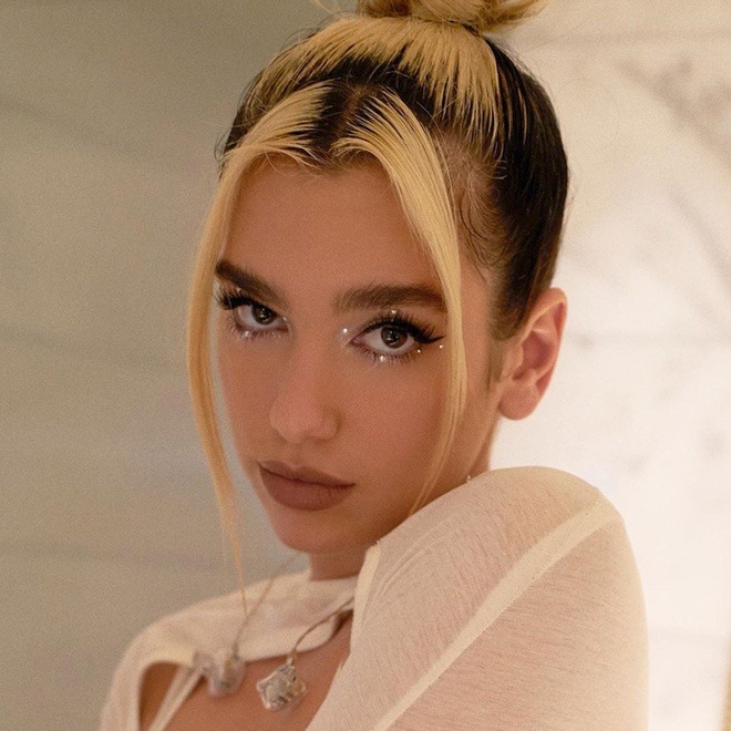 Đối với những bạn thích phong cách "chất ngầu", lối trang điểm cùng kiểu tóc như Dua Lipa là hợp lý. Màu tóc vàng xen lẫn đen được búi cao, để buông lơi 2 cọng sẽ giúp khuôn mặt thêm thon gọn, thể hiện sự mạnh mẽ, cá tính cho người diện. Không đính theo cụm, nữ ca sĩ 24 tuổi khéo léo dàn trải hạt đều quanh mắt để tạo điểm nhấn. Màu môi tông đất cùng lông mày tô vẽ sắc nét giúp 9X thể hiện được vẻ đẹp quyến rũ của mình. Ảnh: Hypebae.