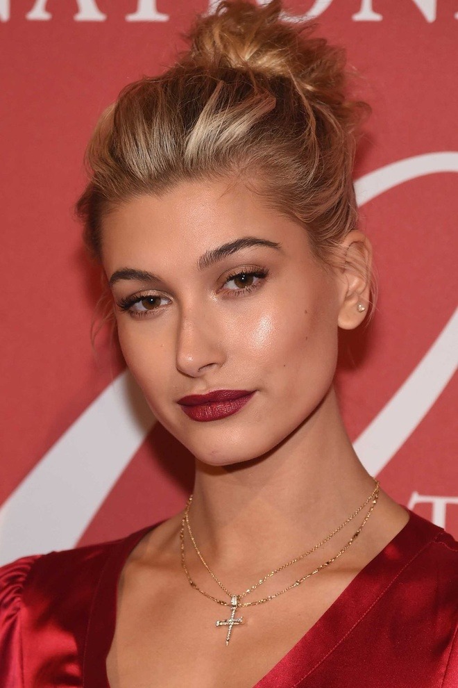 Vào dịp Giáng sinh, bạn có thể phải tham gia nhiều buổi tiệc sang trọng. Hội chị em hãy học Hailey Bieber búi tóc rối và trang điểm theo phong cách quyến rũ với môi đỏ thẫm. Tạo khối và highlight là 2 bước không thể bỏ qua nếu bạn muốn gương mặt góc cạnh, sắc sảo hơn. Ngoài ra, những phụ kiện nhỏ như dây chuyền hoặc hoa tai là "trợ thủ" giúp tạo điểm nhấn cho tổng thể. Ảnh: Cosmopolitan.