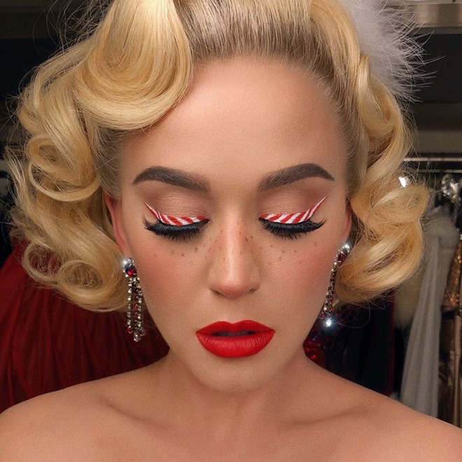 Nếu đang bí ý tưởng cho mùa Giáng sinh năm nay, phong cách trang điểm của Katy Perry trong MV Cozy Little Christmas là gợi ý không tồi. Bạn dùng cọ nhỏ, son môi và keo dán mi giả hoàn thành hình cây kẹo. Để tổng thể nổi bật, hội chị em đừng quên gắn lông mi giả nhằm tạo nét quyến rũ. Màu son đỏ thuần cùng vài chấm tàn nhang sẽ giúp bạn nổi bật giữa mùa đông. Ảnh: Buro.
