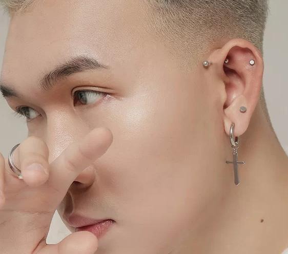 Đây là dáng khuyên tai dài được nhiều anh chàng cá tính lựa chọn. Mẫu đính dưới khuyên tai hình thánh giá chữ thập, tôn thêm góc cạnh và nam tính.