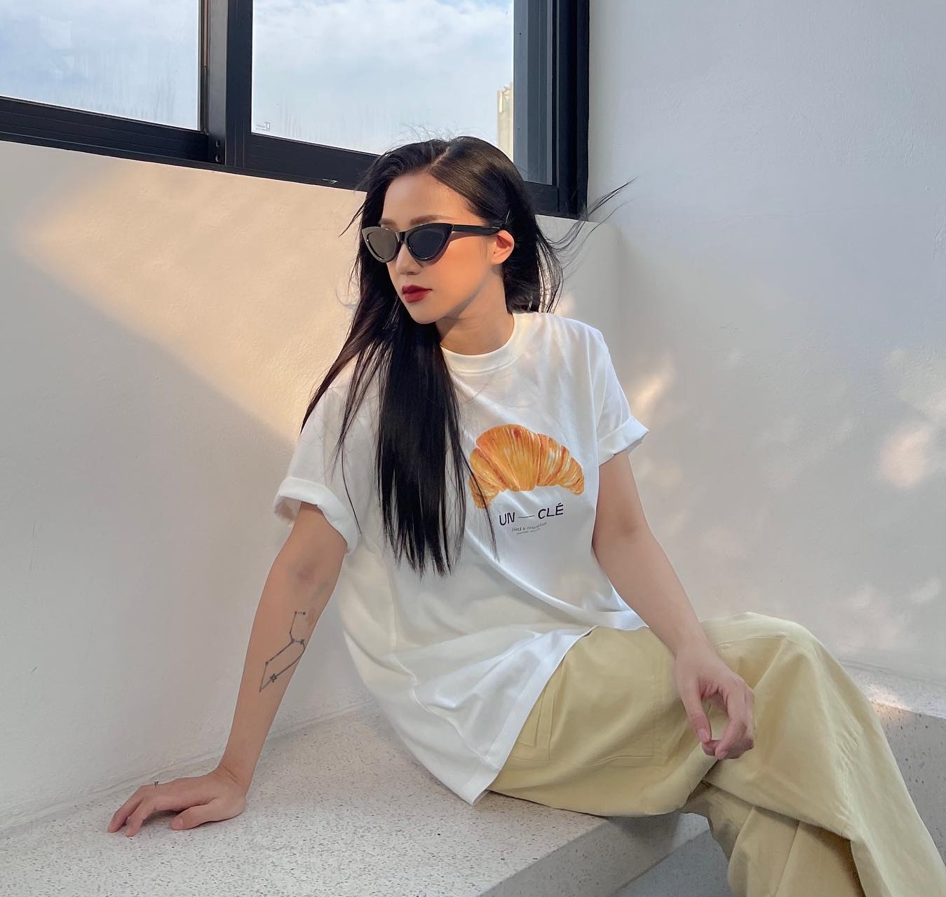 Áo trắng và quần màu be là bộ đôi hoàn hảo. Công thức này rất trẻ trung mà vẫn có sự trang nhã. Vào những ngày hè nóng bức, áo trắng và quần màu be sẽ cho hiệu quả giải nhiệt. Khi diện công thức này, Salim bỏ qua thao tác sơ vin để set đồ thêm thoải mái, phóng khoáng.