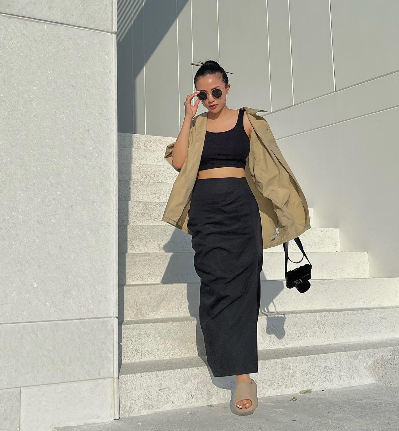 Bộ trang phục của Salim mang tông màu đen và be làm chủ đạo. Dẫu vậy, set đồ vẫn nổi bật nhờ các món thời trang như áo crop top, chân váy dài và sơ mi dáng rộng khoác ngoài. Mẫu áo crop top cho hiệu quả tôn dáng tốt, đồng thời tôn lên nét quyến rũ của người mặc.