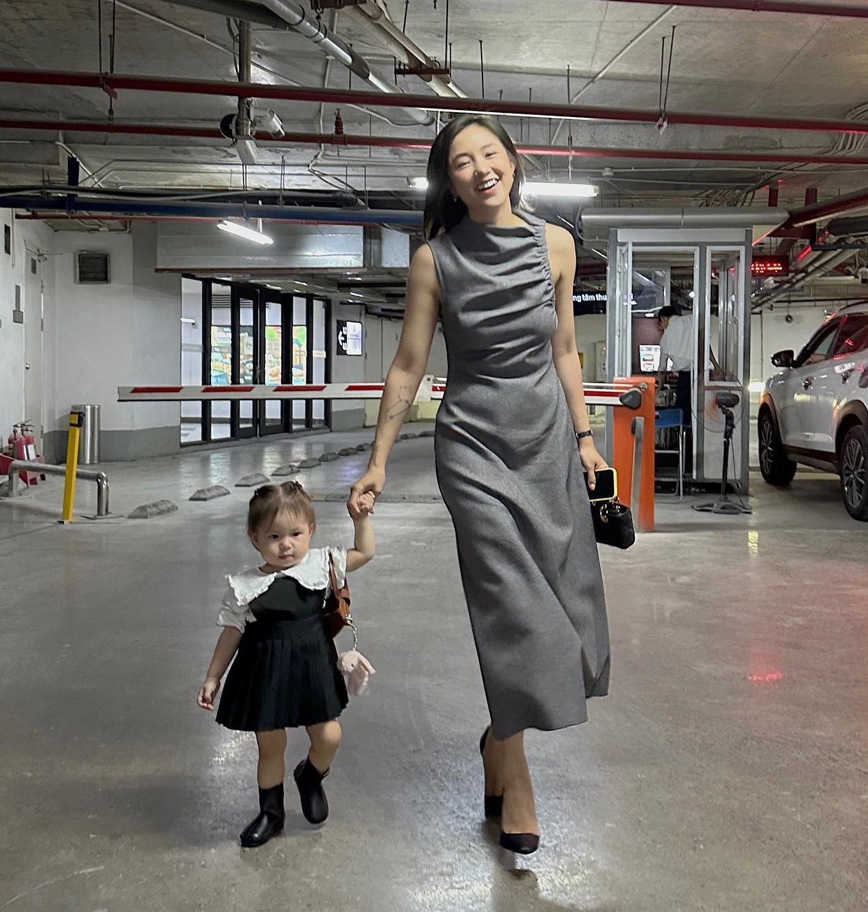 Sang trọng và tinh tế là ưu điểm của set váy xám + giày cao gót mũi nhọn mà Salim đang diện. Set trang phục này là ý tưởng đáng tham khảo cho những buổi tiệc hoặc khi dự đám cưới. Thiết kế gọn gàng của mẫu váy cho hiệu quả tôn dáng tốt.