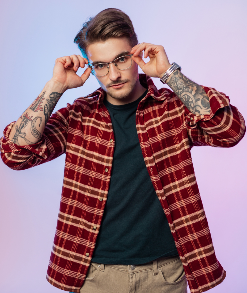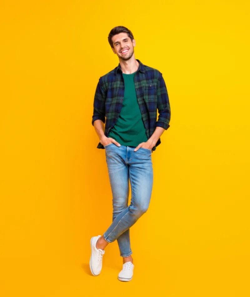 Chiếc áo phông màu xanh lá cây kết hợp với áo sơ mi ca rô màu xanh lam và xanh lá cây mang lại cảm giác mộc mạc, lấy cảm hứng từ thiên nhiên. Áo phông phải vừa vặn, vừa vặn trên vai và cánh tay.
