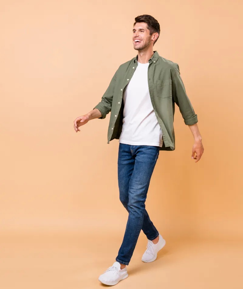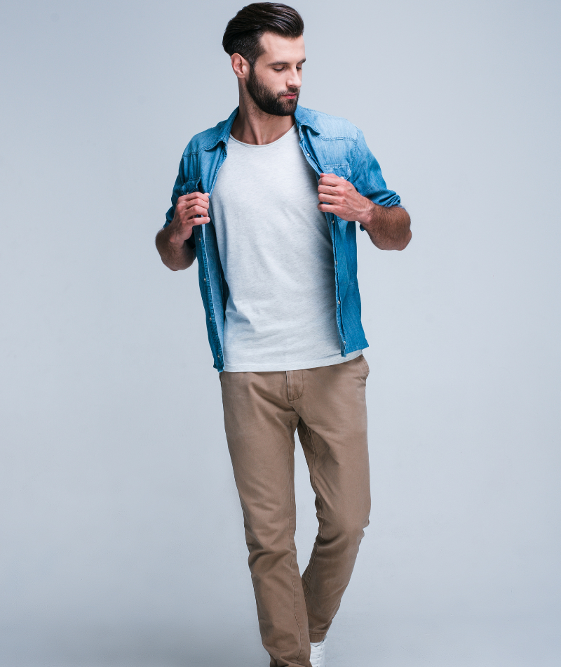 Đối với nửa dưới, hãy chọn quần chinos kaki hoặc quần jean tối màu. Thêm một số giày thể thao màu trắng hoặc bốt sa mạc để hoàn thiện vẻ ngoài.