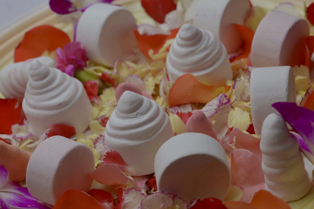Đội ngũ chế tác gồm các cung nhân bắt đầu sản xuất phấn với nguyên liệu bột cao lanh từ các cửa hàng uy tín nhất lúc bấy giờ. Bột này đem về nướng lên bằng than, gạn đi gạn lại nhiều lần để loại bỏ tạp chất rồi sau đó đổ thành những nụ hoa, đem phơi khô cẩn thận và đem ướp với thảo dược hay hương hoa. Việc chế biến nghe chừng đơn giản nhưng khi làm phải hết sức sạch sẽ, tỷ lệ nước-bột phải hợp lý, thời gian gạn, nặn và ướp hương phải nghiêm ngặt.