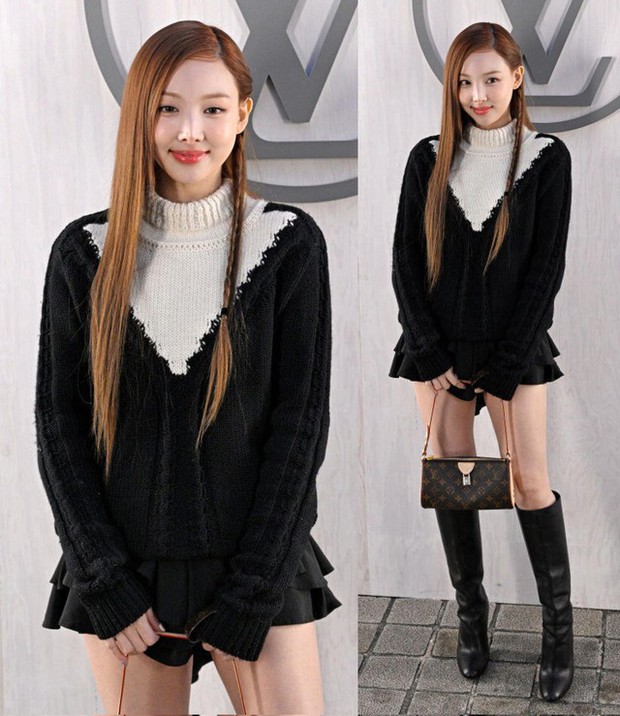 Nayeon (TWICE) đẹp ngọt ngào trong một chiếc mini dress của nhà mốt. Nữ nghệ sĩ để kiểu tóc tết nữ tính, hoàn thiện tạo hình với túi xách hoạ tiết monogram và boots cao cổ đen của nhà mốt.